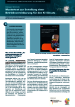 Betriebsvereinbarung für den KI-Einsatz (109_Betriebsräte - PDF) Die Praxishilfe „Betriebsvereinbarung für Künstliche Intelligenz leicht gemacht“ enthält Mustertexte zur Erstellung von Guidelines oder Betriebsvereinbarungen zum Einsatz von Künstlicher Intelligenz (KI) im Betrieb. Die Mustertexte helfen Betriebsräten, selbst eine entsprechende Vereinbarung mit ihrem Arbeitgeber für ihren Betrieb zu verfassen. -